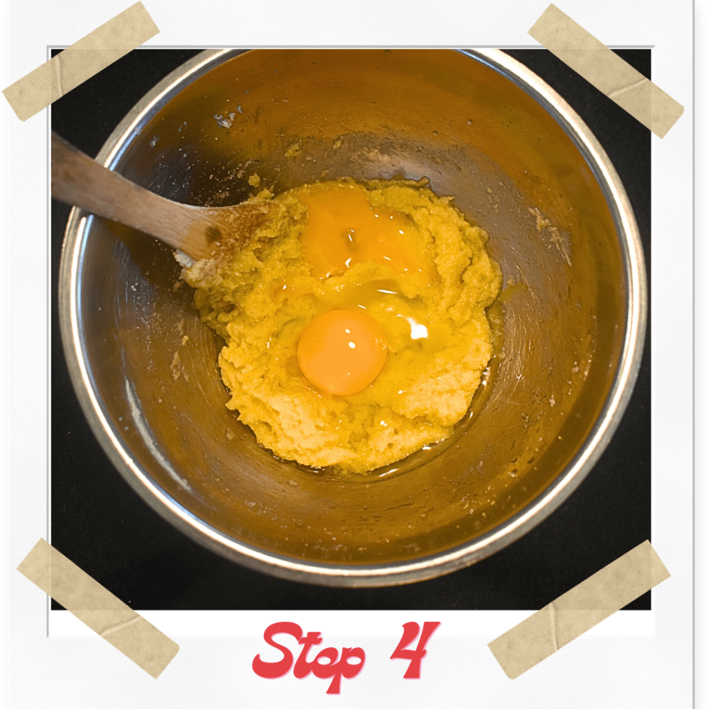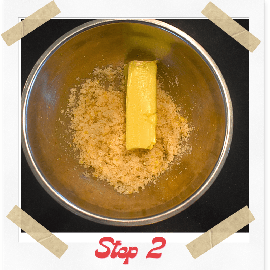 Cream 1 stick of room temperature butter into sugar mixture. Again, I like to do this by hand.